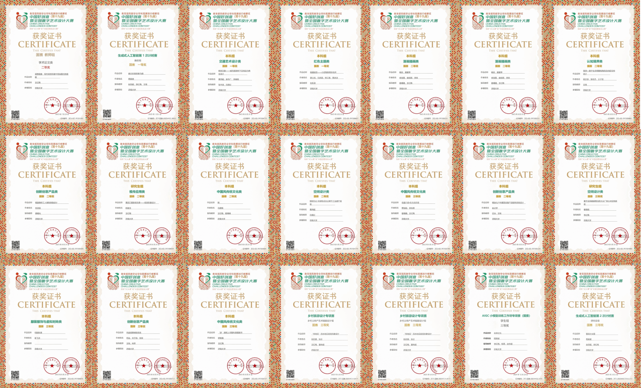 大赛设立社会创新、漫画插画、认知境界、空间设计、中国风传统文化等多个赛道,全面考察参赛者的创意水平与设计表达能力。员工组中,由张中波、吕晨红老师指导,黄玮超、崔本广、李春晓完成的作品《桥间万象——城市高架桥下空间活力再生设计》获交通艺术设计类全国一等奖;由刘东涛老师指导,邵心如、马润涵、修江珊、贾冰洁完成的作品《地道迷宫——小动物的奇妙战术》获红色主题类全国一等奖;由赵忠超、李红梅、王薇老师指导,周昊健完成的《唐三彩骆驼载马俑》获生成式人工智能第1次计时赛高校组全国一等奖。另有《茧序—基于生命周期视角的自闭症空间设计》、《即时办公·半游牧式办公潮下工业遗产改造》等7项作品获全国二等奖;《基于全民健康理念的大众广场公共空间改造》、《非遗八相•东方启示录》等8项作品获全国三等奖。教师组中,王红梅老师的学术论文《观物取象:现代视觉形象中民俗图式的意蕴》获全国二等奖,《压油沟田园综合体视觉形象设计》、《倾听你的声音》两项作品荣获全国三等奖。此外,吕晨红老师荣获本届大赛特殊贡献奖,王红梅、翟晴晴、李红梅、王薇等11位教师获国赛优秀指导教师奖。