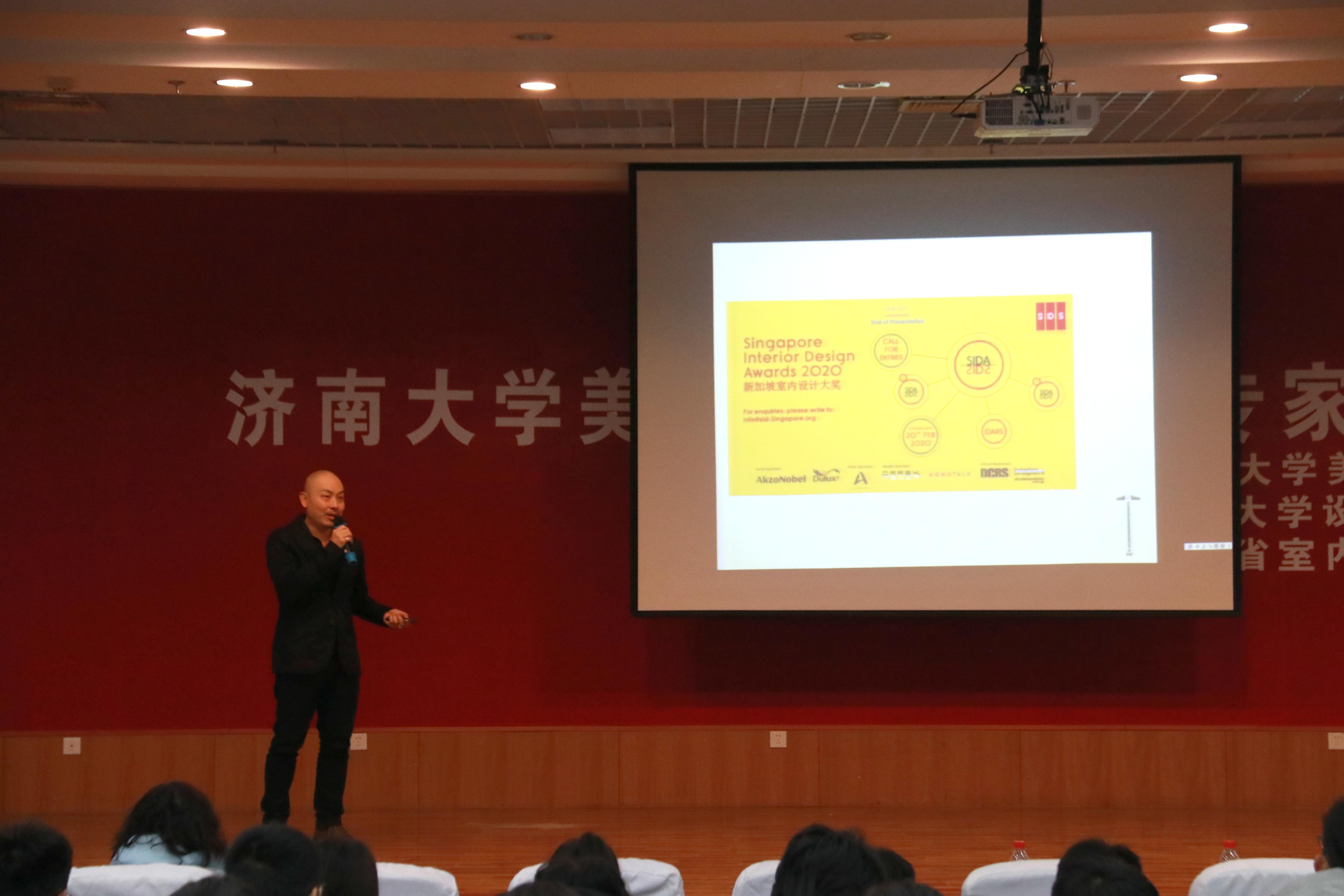 报告会伊始,李光红副董事长分别为新加坡室内设计师协会理事长王胜杰和山东省室内设计行业协会秘书长何金朔颁发客座教授、双创导师聘书。新加坡室内设计师协会理事长王胜杰为大家带来一场主题为“室内建筑学方法论”的讲座。王胜杰理事长以设计师要有探险家和侦探的思考方法为切入点,讲述了形体的创造、形体的接触方式、注射建筑方法论等概念。并结合自己多年的设计作品,从平面图、效果图、成品图等多层维度,对零售空间、酒店空间、餐饮空间、公共机构空间、办公空间、住宅空间这六种空间设计展开叙述与解读。昆明滇峰概念店、平江狮口崖酒店、中南大学咖啡厅、新加坡山边小别墅等等,这一个个精彩绝伦又充满匠心的作品,将在场师生都带入了设计唯美又新奇的世界。感性设计,理性思考,因地制宜,就地取材,王胜杰用自己的作品与行动,为我们展现了一名设计师的责任与匠心。最后,王胜杰说:“创意是一种探险,每一步的前进都是新的体验。”让我们看到了一位优秀设计师的热爱和坚持。