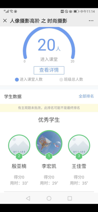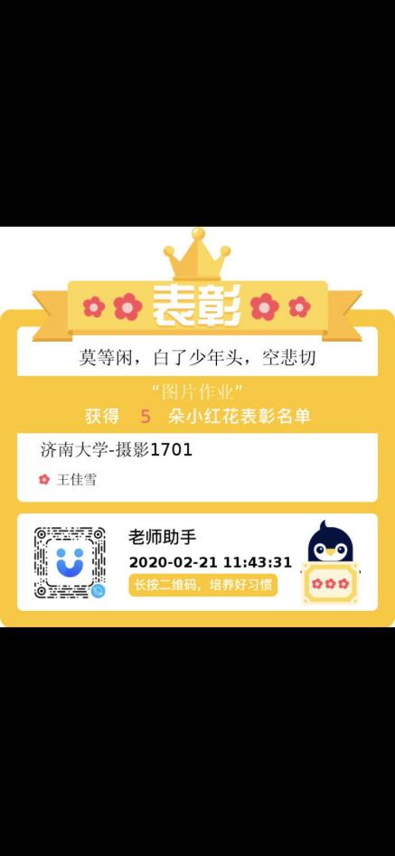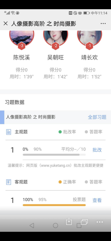 摄影系徐园园老师,通过雨课堂、QQ直播相结合,不仅课前准备充分,而且在课堂练习、现场评分、课后作品投票等环节做了非常好的设计,让网络教学的效果充分发挥出来,极大地调动了员工的积极性。