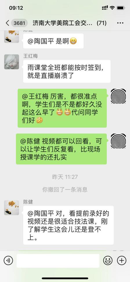 董传超临时接替外聘老师授课19设计3-4班68人,形式基础2课程在学习通录播课程。雨课堂授课翻车,员工白等,无直播权限。因课表是外聘老师。转战微信群发资料。