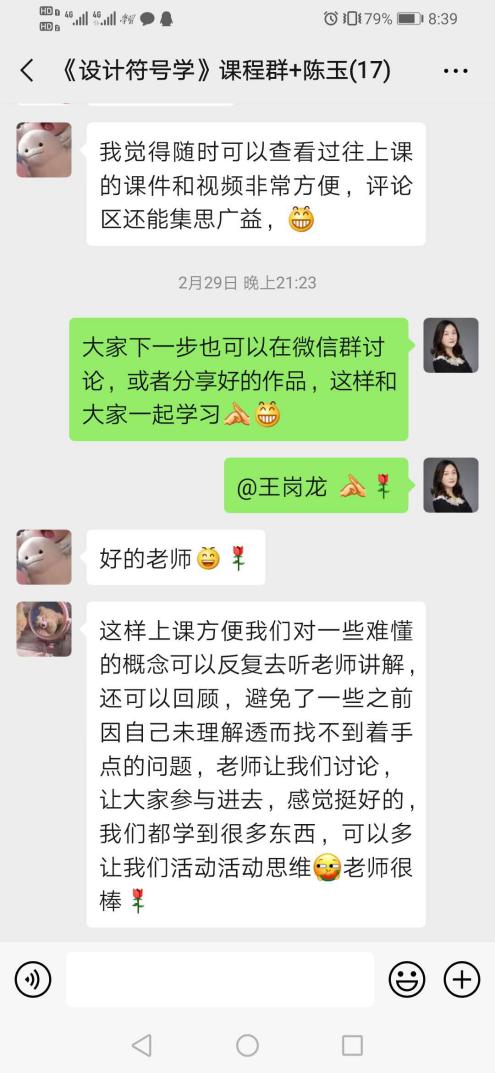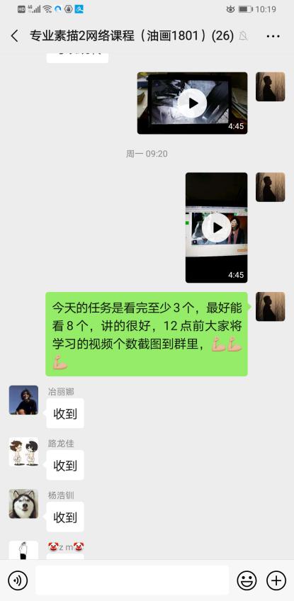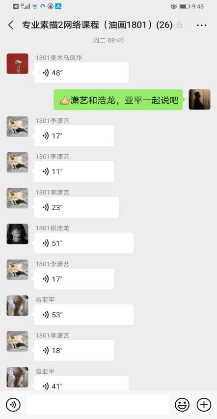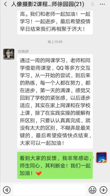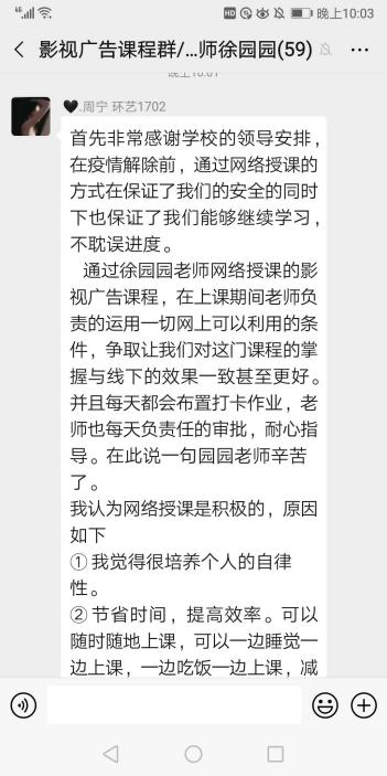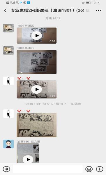 丁奕翔老师:目前所开课程为大一专业基础课。根据专业特点,在授课群的基础上,另外建立了国画、油画、综绘三个不同的专业方向群,使员工的讨论更有针对性,效果更佳。另外,认真总结第一周的教学状况,并提出第二周的改进内容,为保证线上教学质量做好保障。