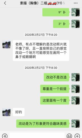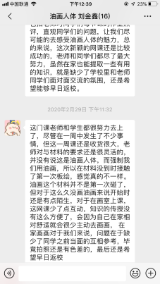 在理论课结束后,便步入实践技巧教学的核心部分!但是,由于疫情的原因造成员工无法买到所需画材以及不同员工对于综合材料专业的认识不同,这就要求在实践教学中要根据员工的实际情况进行灵活的指导。本班员工在本周当中色粉绘制一人,电脑绘制三人,两人水彩,其余皆可油画绘制!第一周采取临摹的方法,上图四张即为本周员工作业,从效果上来看还是有很多可取之处,员工也能够在家里安静的画画!但是,以往我们的课堂教学员工们沟通很多,虽然现在可以通过qq会议等交互软件进行集中讲评,缺少直观的感受还是对员工学习心理产生了一定压力,在课堂反馈中也有多名员工提及(如下图内容所示)!