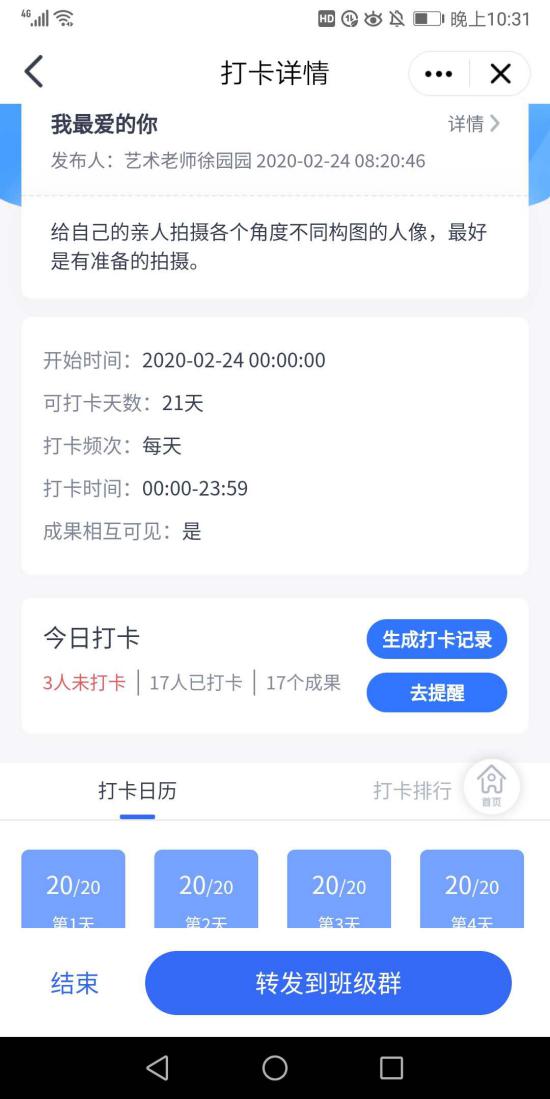 我的课马上进行到开课的第二周,并没有全部在线直播,而是根据课程需要安排了直播与在线学习、在线辅导相并行,我会在QQ课程群,随时管理员工的学习进度,和他们交流学习感受,一起解决遇到的问题。QQ群的“老师助手”可以发布作业也可以师生打卡。通过员工们每天提交的打卡作品我可以深深感受到员工们在一点一滴的进步,那种感觉就好像是看到自己种的庄稼在破土在发芽。