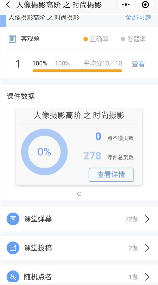 雨课堂强大的互动交流功能可以让我看到员工们的投稿作品,课前我会利用随机点名和弹幕(你最想看到哪位同学的人像作品)产生两名同学发布,并进行点评。深受同学们的喜爱。这样,不仅可以抽查大家的人像摄影知识是否巩固,还可以提醒督促大家要整理仪容有上课的仪式感(毕竟被点名之后再整理拍照就有点晚了)。