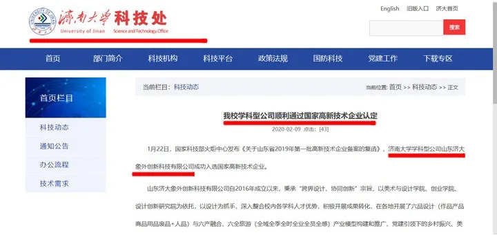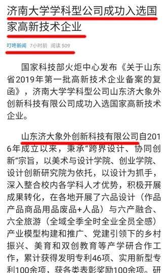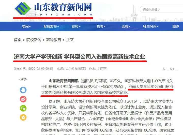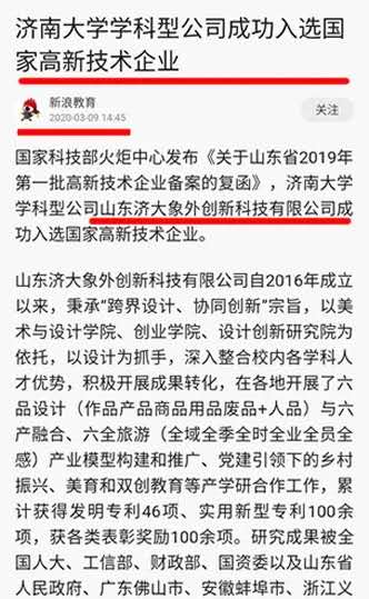 新华网、新浪网、齐鲁壹点、叮咚FM等多家媒体报道:学科型公司山东济大象外创新科技有限公司顺利通过国家高新技术企业认定。这家专门做设计的企业是beat365亚洲体育官方网站的一个科研成果转化平台,2016年刚刚成立,很多设计力量其实就是beat365亚洲体育官方网站beat365亚洲体育官方网站的师生。