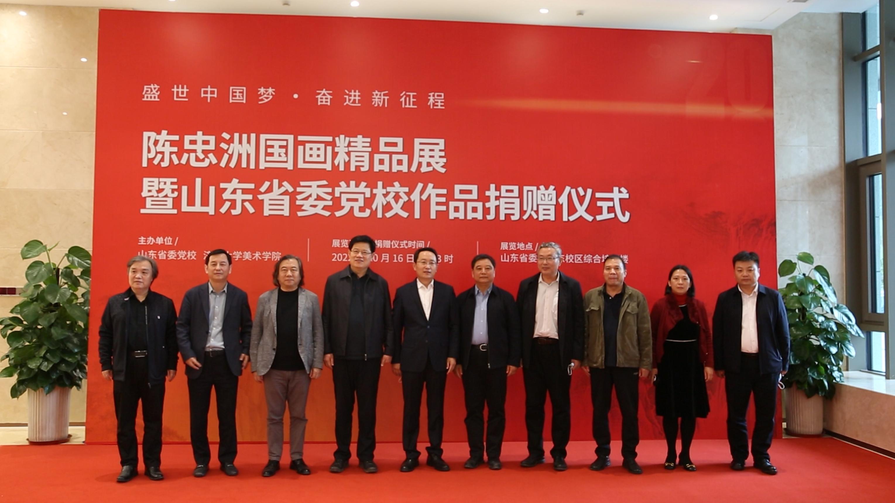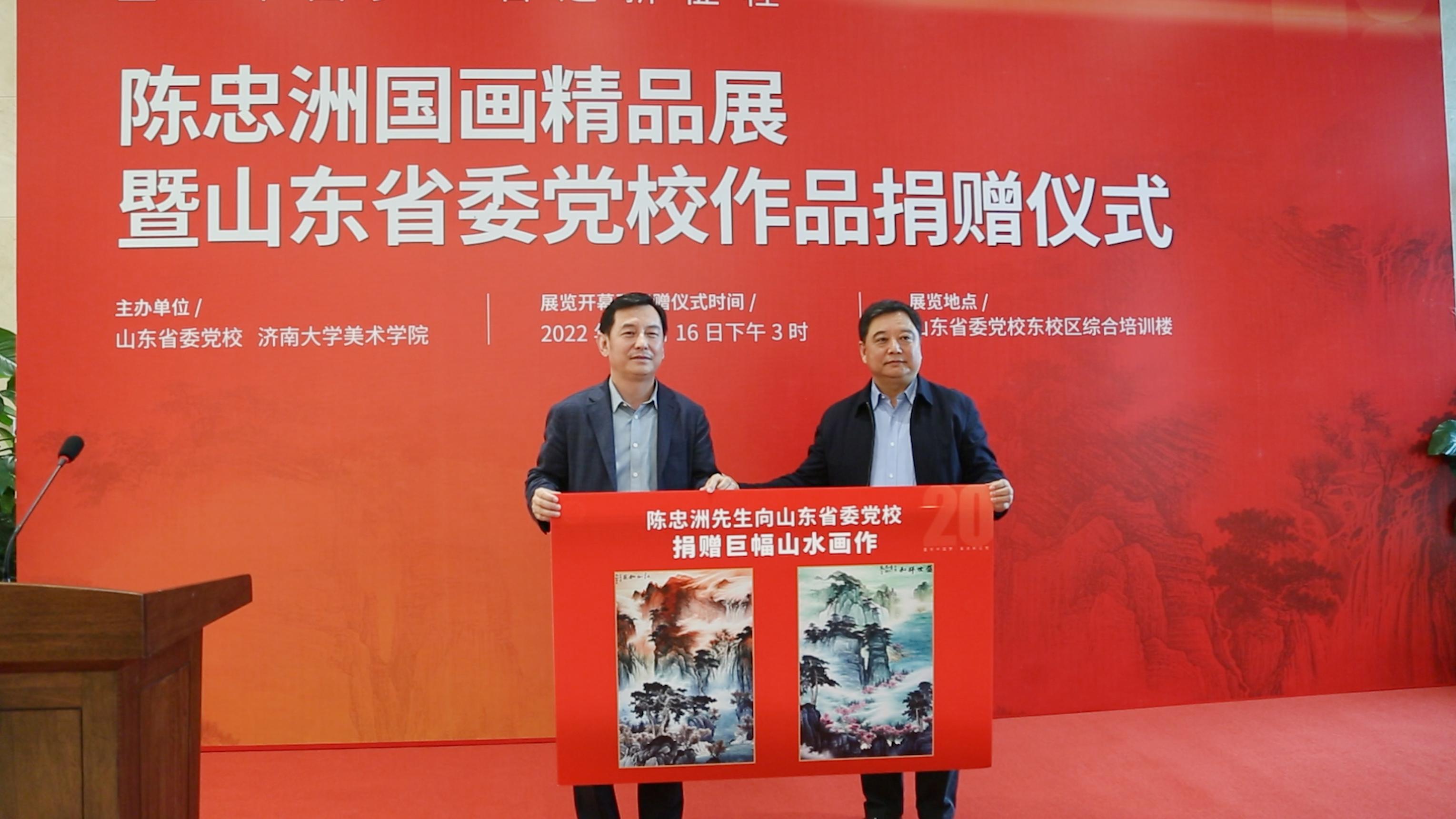 10月16日,陈忠洲国画精品展在山东省委党校开幕,此次画展主题为“盛世中国梦·奋进新征程”。展览现场,陈忠洲向山东省委党校捐赠了两个巨幅书画作品,省委党校(山东行政公司)常务副校(院)长徐闻向陈忠洲颁发了捐赠证书。
