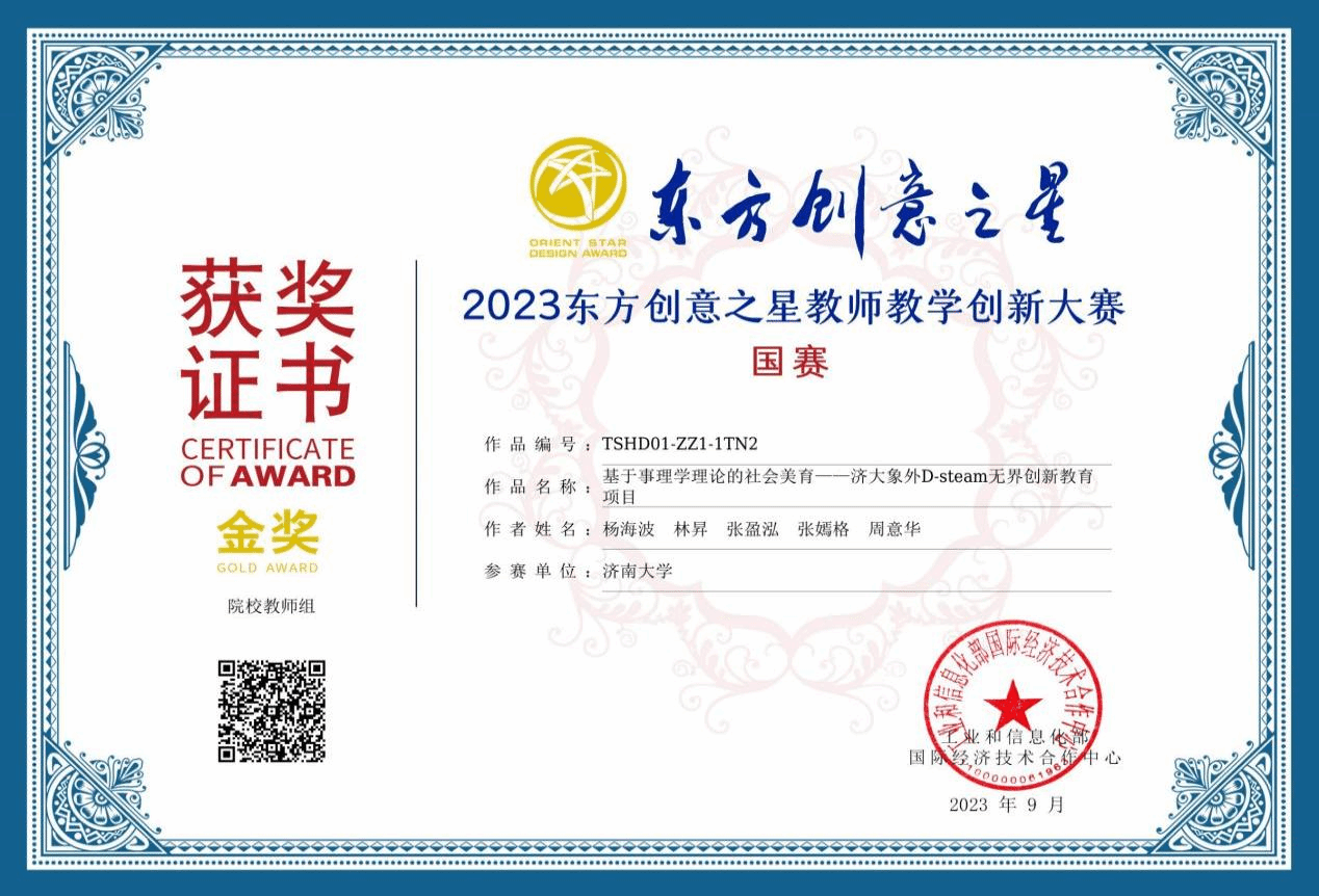近日,第四届东方创意之星教师教学创新大赛国赛评审会在江苏大学举办,beat365亚洲体育官方网站杨海波中华美育无界创新教研团队经过激烈角逐,从全国1502个参赛队伍中脱颖而出,荣获金奖。
