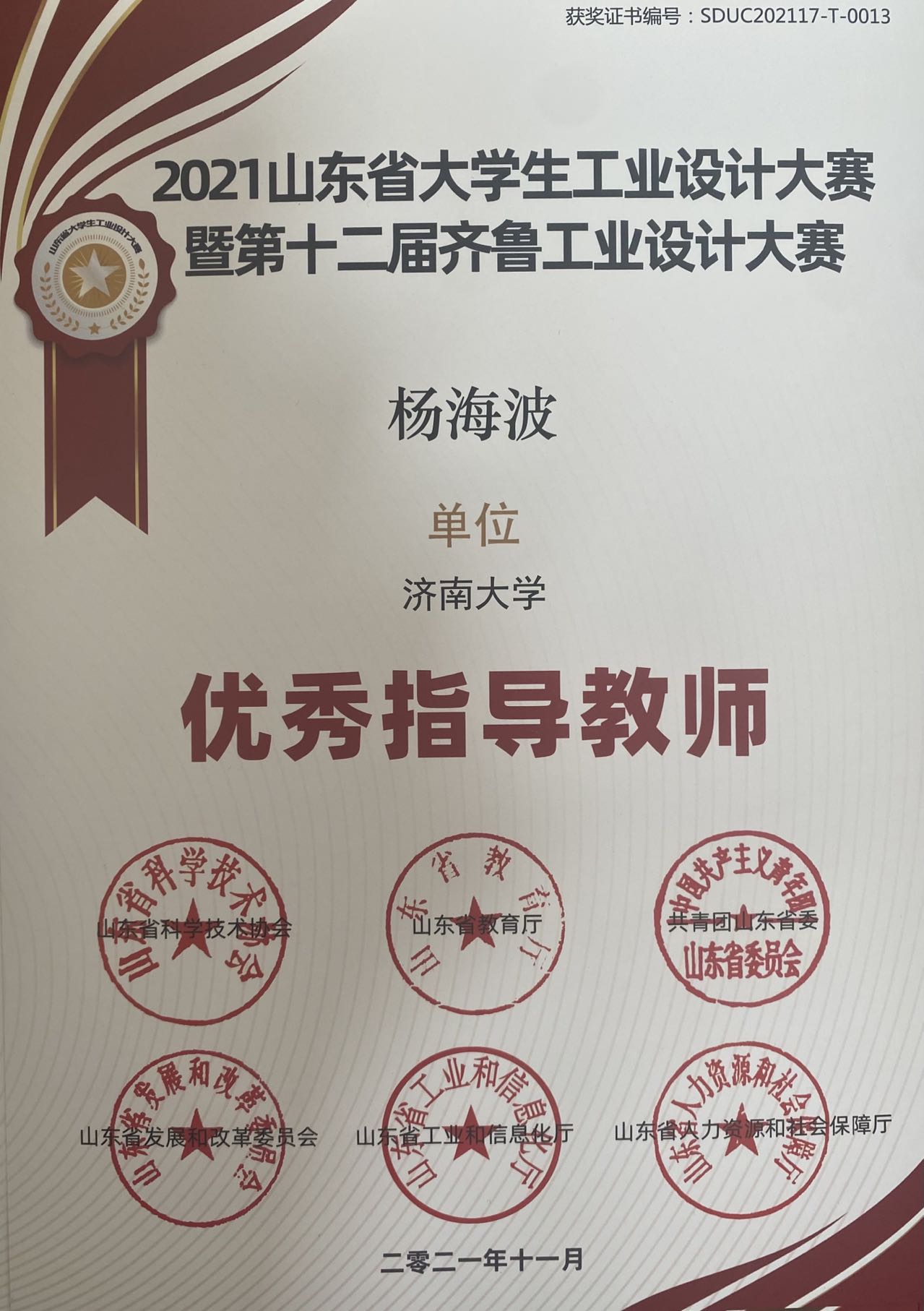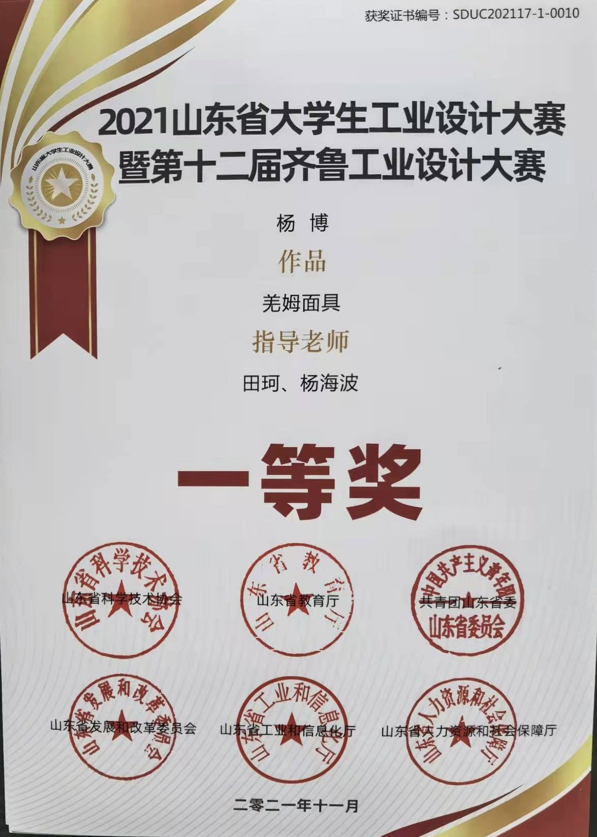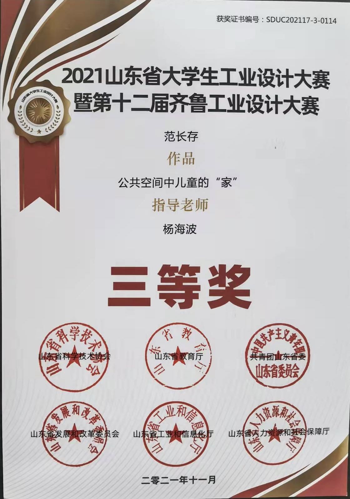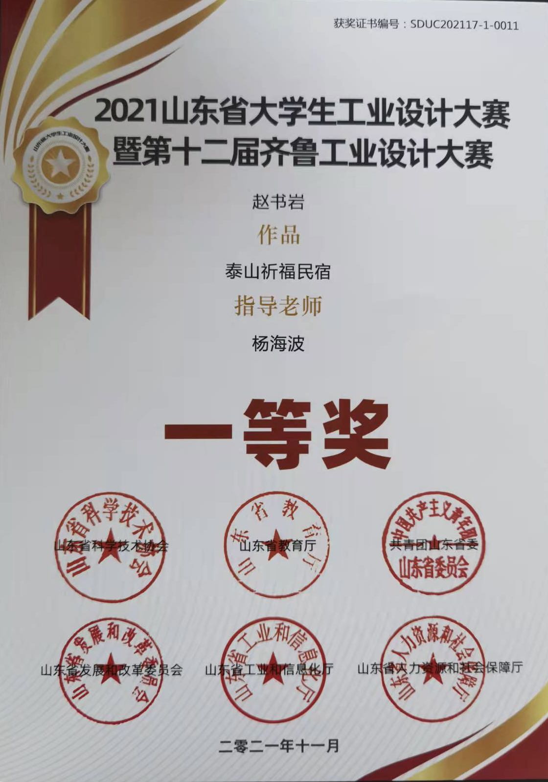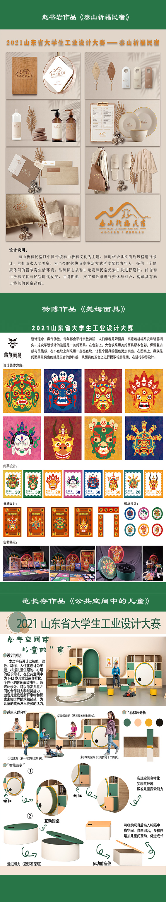 由山东省教育厅、共青团山东省委员会、山东省发展和改革委员会、山东省工业和信息化厅、山东省人力资源和社会保障厅、山东省科学技术协会、联合发起的第十三届山东省老员工科技节——“2021山东省老员工工业设计大赛暨第十二届齐鲁工业设计大赛”于近日圆满落下帷幕。公司师生在本次比赛中硕果累累,成绩斐然。其中,2021级艺术设计专业研究生赵书岩同学作品《泰山祈福民宿》获一等奖;2021级艺术设计专业研究生杨博同学作品《羌姆面具》获一等奖;2021级设计学专业研究生范长存同学作品《公共空间中儿童的“家”》获三等奖;杨海波获优秀指导教师奖。