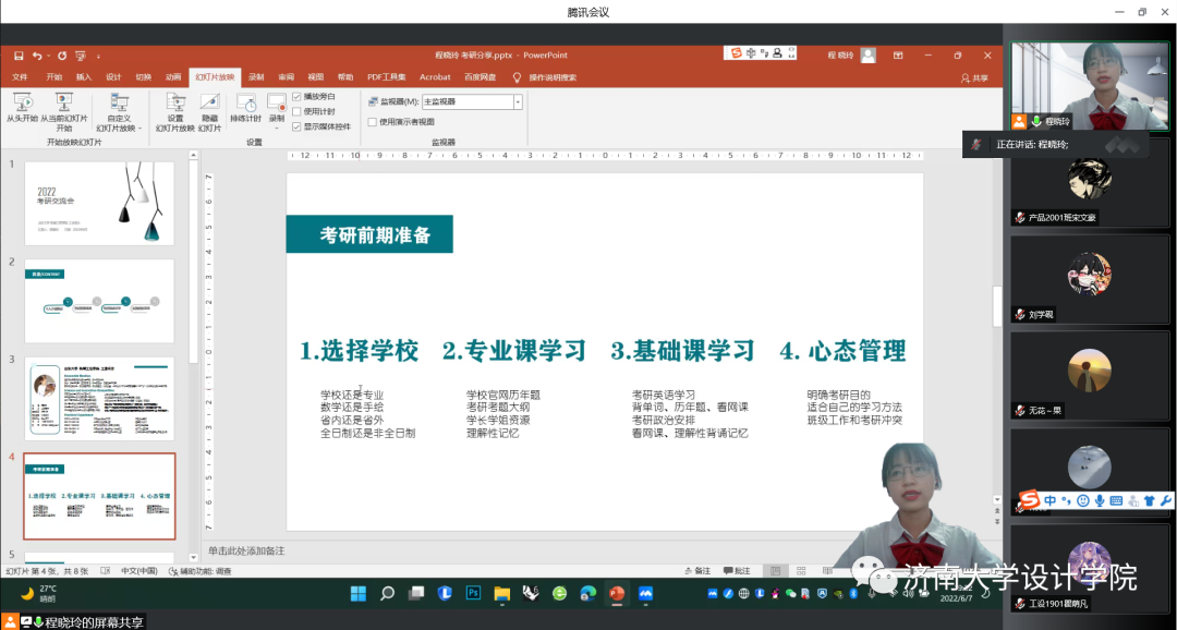 会议伊始,工业设计专业程晓玲同学率先进行发言,她首先简单介绍了公司考研的录取情况,针对考研的条件与细节进行详细讲解,以及院校导师的选择、专业课程和基础课程的学习做了详细阐述。