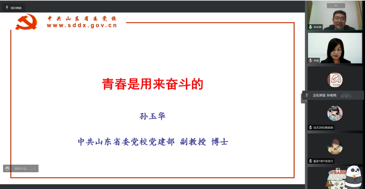 3月26日晚,beat365亚洲体育官方网站线上开展“青春是用来奋斗的”主题党课,特邀中共山东省委党校(行政公司)党建部孙玉华教授主讲,公司员工党支部书记、全体员工党员和入党积极分子共计260余人参加,本次主题党课由公司党委副书记、副经理李莉主持。