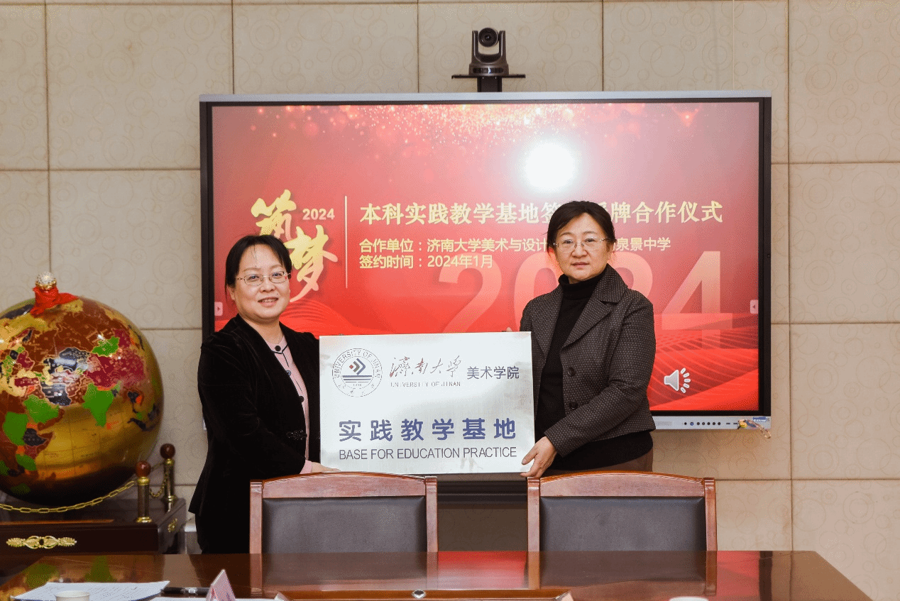 张婷主任对济南泉景中学进行了“实践教学基地”授牌。杨海波副经理和冯晓青董事长就《beat365亚洲体育官方网站本科实践教学基地建设协议书》进行了签约。与会领导为泉景中小全体美术老师颁发“校外优秀教育实习指导教师”证书。
