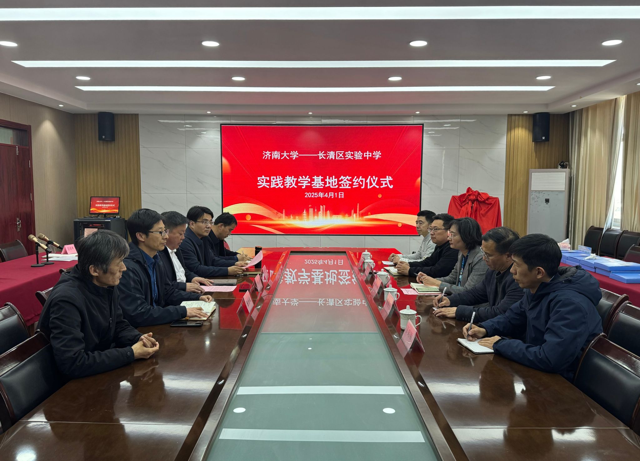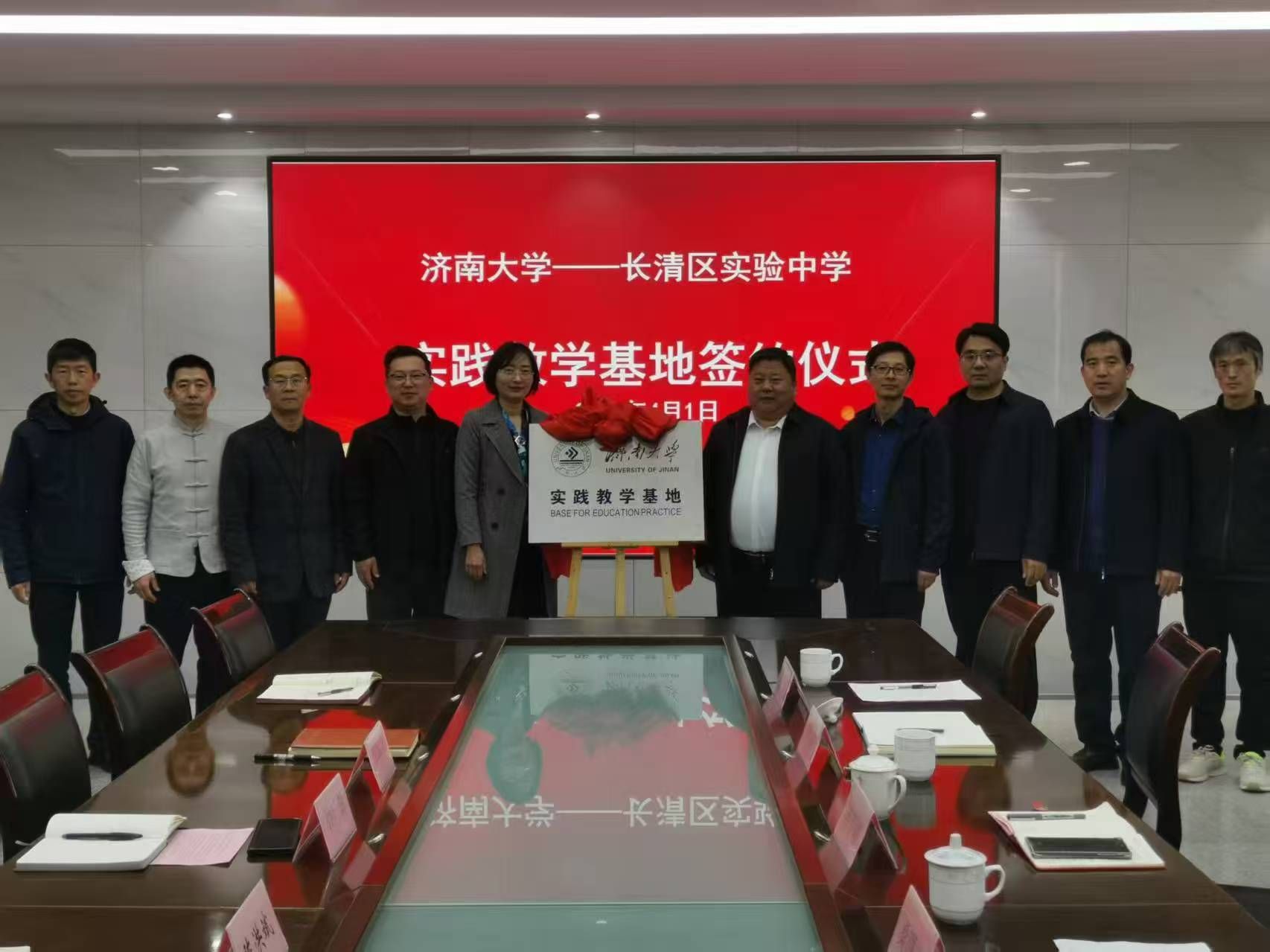 4月1日下午,公司党委书记陈春锋、副经理杨海波、经理助理桑曙光、美术系主任陈炜、教工一支部书记丁奕翔等一行赴长清实验中学开展本科实践教学基地签约授牌仪式。长清区实验中学党总支书记孙广益、董事长陈洪斌、副董事长郑海龙、教育处主任薛平峰等教师代表参加了签约仪式,签约仪式由长清区实验中学副董事长郑海龙主持。